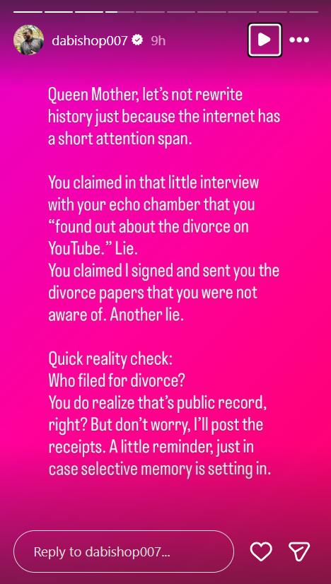 “Queen mother let’s not rewrite history just because the internet has a short attention span. You claimed in that little interview with your echo chamber that you “found out about the divorce on YouTube.” Lie.”