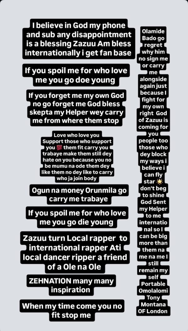 “God of Zazuu is coming for you people too those who dey block my ways i believe i can fly star don’t beg to shine God Sent my Helper to me I international so I can be big more than them.”